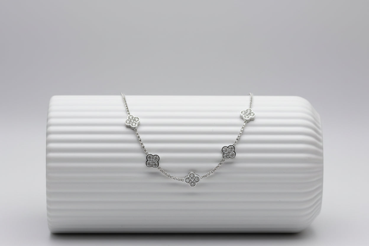 Collar con un delicado diseño de tréboles intercalados, realzados con circones que aportan un brillo intenso y sofisticado. Su presencia luminosa y su caída elegante lo convierten en una pieza ideal para ocasiones especiales como fiestas, celebraciones o matrimonios. Un collar refinado que destaca por sí solo y eleva el look con un toque distinguido y femenino.