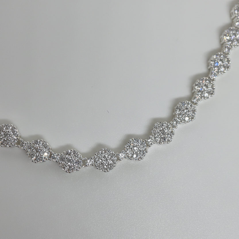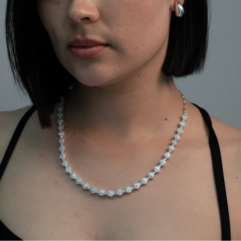 Cadena con diseño continuo de circones que recorren toda la pieza, aportando un brillo parejo y elegante. Su estructura flexible permite que se adapte con naturalidad al cuello, logrando un calce cómodo y visualmente equilibrado. Es una cadena con presencia, pensada principalmente para ocasiones especiales como eventos, celebraciones o looks de noche, ideal para complementar tenidas más formales y sofisticadas.