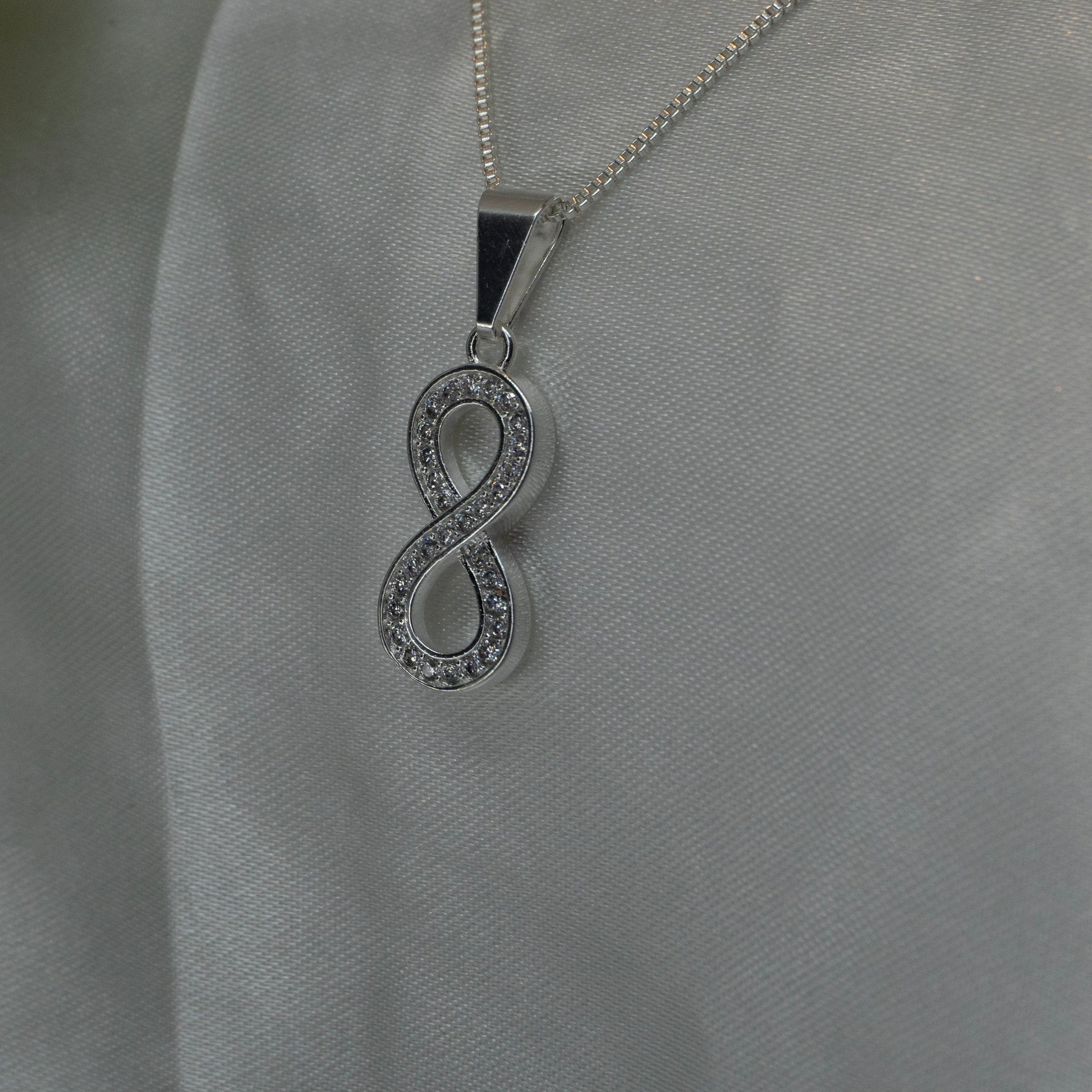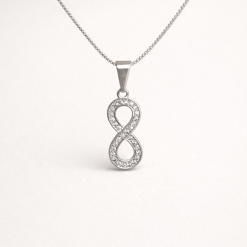 Collar con dije en forma de infinito, delicadamente decorado con circones que aportan un brillo sutil y elegante. Es una pieza fina y equilibrada, ideal para el uso diario. Su diseño atemporal simboliza continuidad y conexión, y lo convierte en un collar fácil de combinar, perfecto para sumar un detalle luminoso y delicado a cualquier look.